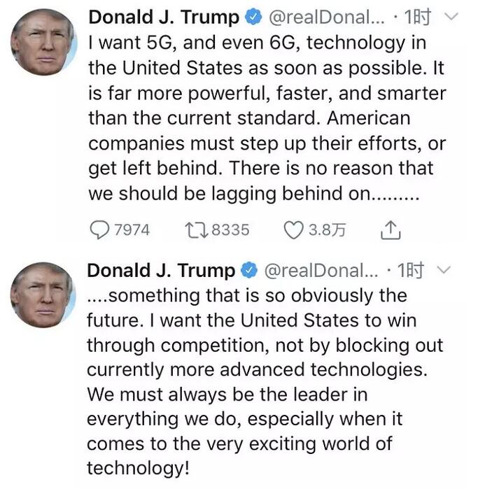 我希望美国尽可能快地发展5G,甚至6G技术,那会比当前的标准更强、更快、更智能。美国公司必须加紧努力,否则就会落后。在那些明显代表未来的领域,美国没有被人甩在身后的理由。我希望美国公司能够通过竞争去获胜,而不是靠封杀当下更先进的技术。不论在我们从事的哪个领域,美国都必须是领导者,尤其是在令人兴奋的科技世界!