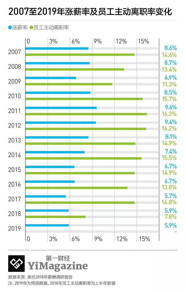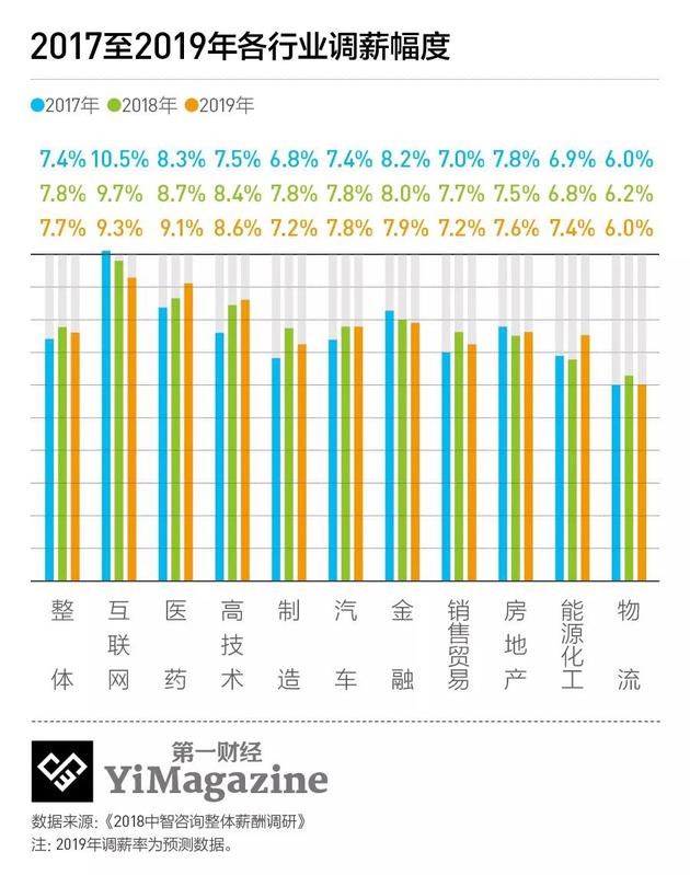 这与企业制定薪酬福利的依据有关。一般企业在年初就已经制定好全年的薪酬福利政策,因此2019年的薪酬涨幅更多取决于企业2018年的经营状况。但从去年下半年开始,许多行业都出现资金紧张、业绩下滑的现象,很多企业从2018年年末就开始行动,通过对人力资源的优化管理,来节约成本,这种调整所带来的影响会继续在2019年的薪酬涨幅中体现。 “第三季度结束后,企业更加保守了,尤其是金融、地产、互联网、汽车、制造这几个行业。”中智咨询人力资本数据中心产品专家张欣对《第一财经》YiMagazine说。