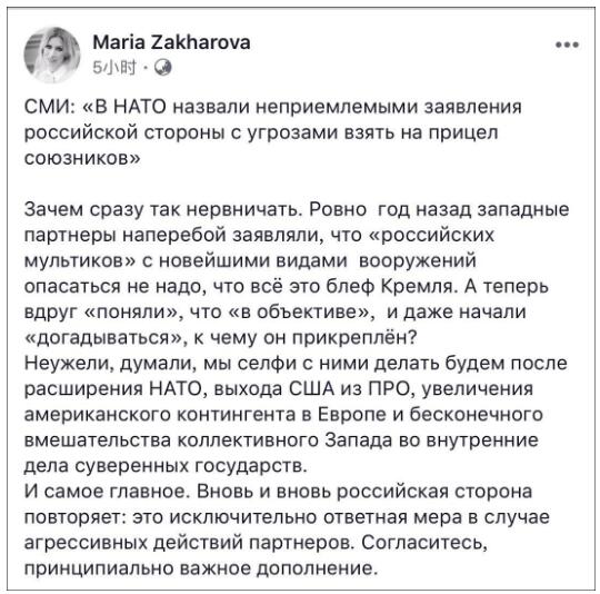 当地时间20日,俄外交部发言人扎哈罗娃(Maria Zakharova)在脸书上质疑北约的反应,她写道:“北约现在为何会对普京总统的表态感到紧张,”“一年前,西方伙伴们可都还在说,不应对俄罗斯动画片里的新型武器感到害怕,克里姆林宫不过是在虚张声势。”