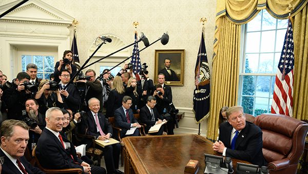 当地时间2月22日,美国总统特朗普在白宫椭圆形办公室会见正在美国进行第七轮中美经贸高级别磋商的习近平主席特使、中共中央政治局委员、国务院副总理、中美全面经济对话中方牵头人刘鹤。 新华社