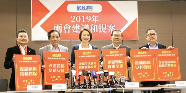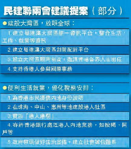 民建聯的人大建議及政協提案共分6項範疇,其中之一是「建設灣區,放眼全球」。建議內容有建立粵港澳大灣區統一資訊平台,以整合生活、工作、就業、學業等方面的資訊,包括具體流程指引,並希望各部門可以簡化香港企業或個人到內地生活、就業、創業的手續。建立大灣區創業配對平台,整合公司註冊、稅務資訊、工商法律等,並簡化香港企業或個人到內地創業及投資的手續。設立大灣區顧問制度,邀請香港各界人士出任顧問,發揮諮詢角色,由特區政府收集他們意見,令相關重大政策更加完善;支持港人參與國際事務,提名港人到國際組織的推薦名單之中,如國際公務員等等。