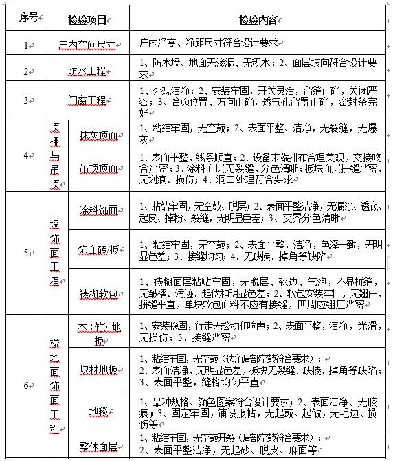同时,《住宅项目规范》对房屋验收交付给出了详细的标准。如对放水工程要求,防水墙、地面无渗漏、无积水;抹灰顶面的要求则是,粘结牢固,无空鼓,表面平整、洁净,无裂缝,无爆灰等等。