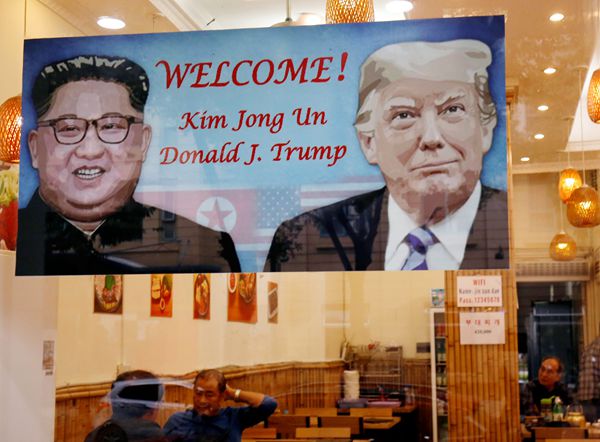 河內一家餐廳張貼海報,歡迎美朝峰會在越南舉行。 路透社