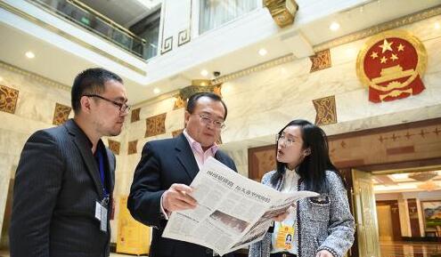 资料图:2018年3月10日,全国人大代表,浙江省纪委书记、浙江省监察委员会主任刘建超(中)翻阅《中国新闻》。中新社