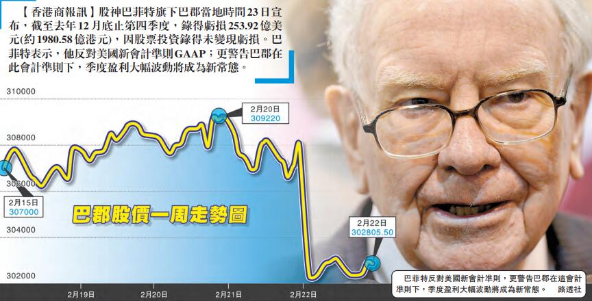 【香港商報网訊】股神巴菲特旗下巴郡當地時間23日宣布,截至去年12月底止第四季度,錄得虧損253.92億美元(約1980.58億港元),因股票投資錄得未變現虧損。巴菲特表示,他反對美國新會計準則GAAP;更警告巴郡在此會計準則下,季度盈利大幅波動將成為新常態。
