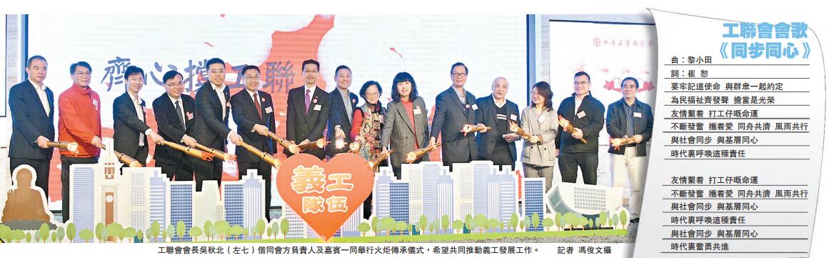 【香港商報网訊】記者周偉立報道:工聯會昨早舉行「金豬報喜賀新春」聯歡會暨義工隊伍建設動員會義工聯歡會,嘉許傑出義工及推動義工隊伍建設嘉許義工。同場亦舉行工聯會會歌《同步同心》首發式,期望繼續與打工仔女同步同心,再創輝煌。聯歡會有逾千人出席,氣氛熱烈。工聯會會長吳秋北致辭表示,隨國家發展進入新時代,香港亦要配合轉變,期望工聯會未來可建立起一隊5萬至6萬人的義工隊,將「工聯人」的光輝繼續薪火相傳,為國家及香港出力。