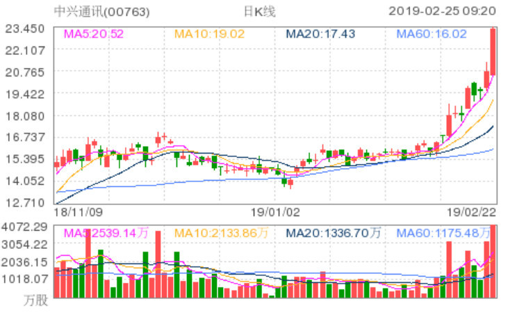 2、华为概念股集体走强,新亚制程(5.690, 0.52, 10.06%)、意华股份(22.170, 2.02, 10.02%)、电连技术(34.980, 3.18, 10.00%)、南天信息(12.650, 1.15, 10.00%)、宜安科技(10.570, 0.96,9.99%)、京东方A、浙江富润(7.500, 0.68, 9.97%)涨停,深南电路(120.800, 10.98, 10.00%)、沪电股份(11.750, 1.07, 10.02%)等纷纷大涨。消息面上,2月24日晚间,华为在西班牙巴塞罗那召开新品发布会,推出旗下首款5G手机,名为Mate X,定价2299欧元,8+512GB版本,华为称这款手机将在2019年年中上市。