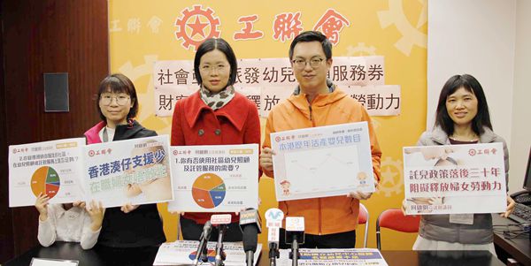 工聯會昨日就幼兒政策召開記者會,多名婦女希望政府在《財政預算案》中加強支援。育有3子女的阿華是家庭主婦,她指由於社區託兒服務價格高昂,故被迫全職照顧孩子,「我都要等小朋友升小學先可以外出搵工作,雖然現時都有不少朋友找我做兼職,但因為非常困身(照顧子女)。」育有2子女的何女士亦坦言託兒服務「貴到嚇人」,「我索性自己找別人幫忙,三餐都難保,更何況找託兒服務呢。」她現時投身時間較為彈性的保險行業,「有時無人可以幫忙照顧,唯有帶他們一同見客。」