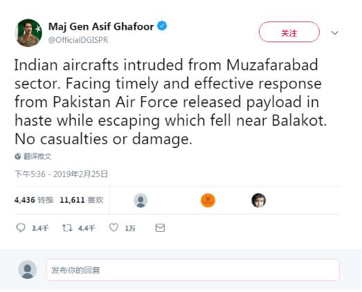 巴基斯坦军方发言人阿西夫·卡夫尔少将在其官方推特上表示,印度空军与2月26日非法传入巴基斯坦控制的克什米尔地区,随后巴基斯坦空军派出战机拦截。随后,巴基斯坦空军发言人发布第二条推特称,印度战机在遭到驱离,逃离巴控克什米尔地区时,匆忙抛弃了有效载荷。印度战机闯入克什米尔没有人员伤亡和损失。随后卡夫尔少将公布印度抛弃的载荷照片。