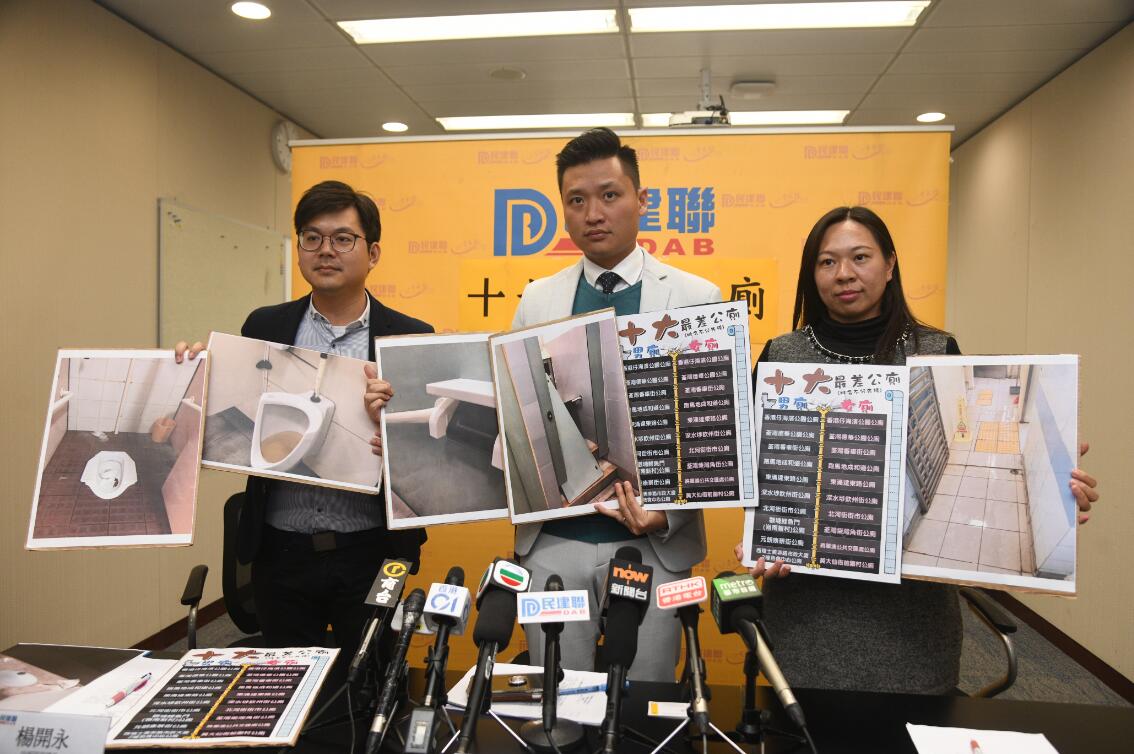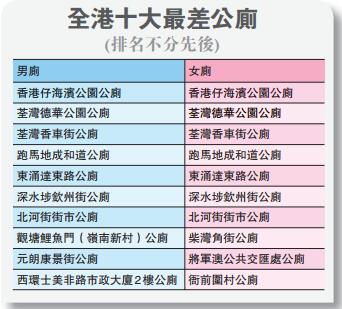 民建聯於本年1月至2月初進行「最差公廁大搜查」,發動義工在全港由食環署管理的公廁,隨機抽樣巡查67個公廁,就座廁、地板、洗手盆清潔、廁紙供應、通風等項目進行評審;同時再結合各區議員、幹事日常工作所知,包括:親身觀察和接收的投訴等,得出十大最差男女公廁的排行榜(見附表)。