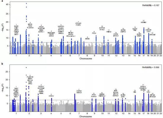 ▲与频繁失眠(上)和包括偶尔失眠在内的各类失眠(下)相关的全基因组分析找到了57个基因位点(图片来源:参考资料[1])