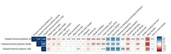 这项研究中,科学家们发现回答“经常失眠”的受试者与肥胖特征、冠心病、神经质、吸烟行为、抑郁症状等在遗传上有显著的正向相关性。