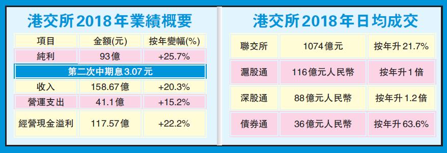 去年港股平均每日成交金額1074億元,按年增長22%,創新高。期交所的衍生產品合約平均每日成交張數增長56%,至68.66萬張。营運支出方面則較2017年增加15%,源自僱員費用、資訊技術支出及樓宇支出增加。EBITDA利潤率為74%,較2017年增加1個百分點。