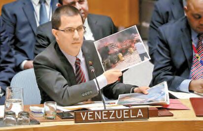 在安理会上,委内瑞拉外长阿雷亚萨拿着反对派焚烧油车的照片。路透社