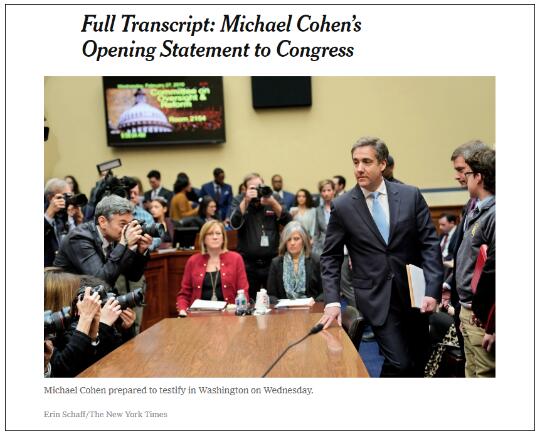 这名重要证人就是特朗普的前私人律师迈克尔·科恩(Michael Cohen),他当天出席了由国会众议院举行的为期3天听证会。三天中,只有27日的听证会是公开的,面向全美直播。而其余两日均不对外公开。