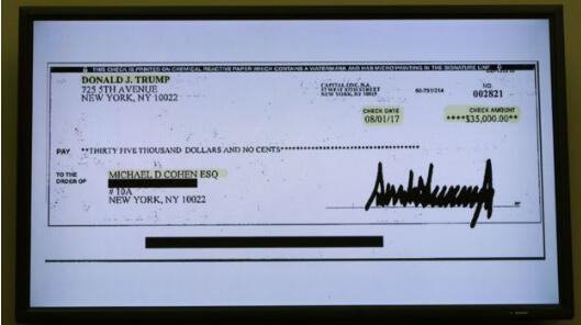 在会上,科恩还提供了一份从特朗普个人银行账户开出的支票复印件。科恩称这是特朗普偿还他为其垫付艳星丹妮尔斯的“封口费”,以防止对其竞选活动造成损害。