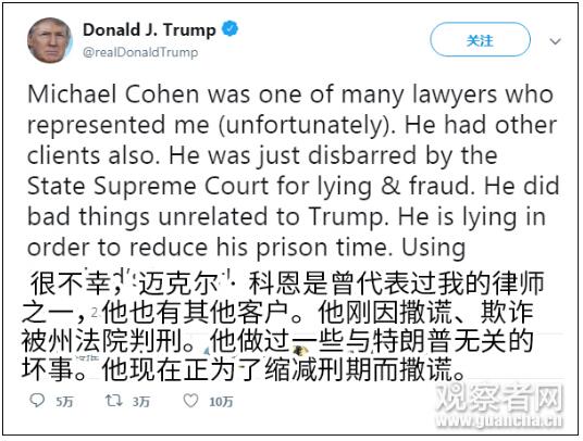 在这次听证会之前,特朗普当天稍早曾在推特上发文指责科恩,称他因说谎和欺诈被取消了律师资格,“他做了与特朗普无关的坏事,他在为缩短刑期而撒谎。”