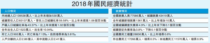【香港商報网訊】國家統計局昨天公布《2018年國民經濟和社會發展統計公報》。公報顯示,2018年年末,內地總人口139538萬人,常住人口城鎮化率為59.58%,比上年末提高1.06個百分點。戶籍人口城鎮化率為43.37%,比上年末提高1.02個百分點。
