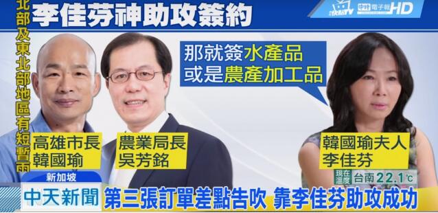 台湾“中天新闻”2月28日对在他们新加坡谈判的细节进行了报道,提及韩国瑜夫人李佳芬在团队谈第三个大单时巧提建议,解决双方争议,促成合作。