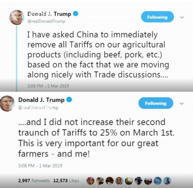 “我已经要求中国立即取消针对美国农业产品的所有关税(包括牛肉、猪肉等),这是基于我们在贸易谈判中进展良好的事实。我在3月1号没有对第二批中国商品加征25%的关税。这对于我们伟大的农民和我都非常重要。”特朗普当天在推特上发文说。