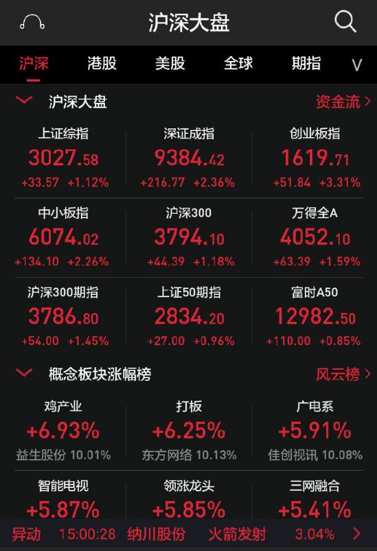 【香港商报网讯】3月4日消息,今日两市高开后,持续走高,沪指收复3000点关口,创指一度大涨逾5%,站上1600点,视听器材成今日上涨主力军,行业板块全线上涨,午后券商股跳水,三大股指相继走低,涨幅均有所缩小,市场呈现冲高回落走势,但是两市个股依旧涨多跌少,成交额再破万亿,赚钱效应显著回升。