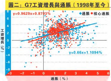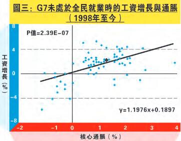 至於工資增長方面,圖二顯示G7過往二十年的工資增長與通脹關係。整體而言,兩者同向關係密切,其中工資增長與核心通脹的同向關係更高。那麼現在可觀察工資增長與核心通脹的關係會否在不同的就業環境下出現變化。