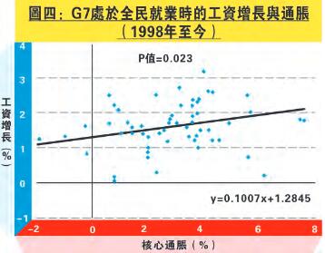 先抽出G7未處於全民就業時的工資增長及通脹數據,得出圖三。按回歸分析得出的p值接近零,可見過往二十年兩者明顯同向成立。在(u-u*>0)的環境下,工資增長與核心通脹的斜率為1.20。隨後,換上G7處於全民就業時的數據,得出圖四,工資增長與核心通脹的斜率僅為0.01。因此,根據過往二十年G7數據,工資增長與核心通脹的斜率在(u-u*>0)的環境下比(u-u*<0)時高。換言之,初步推斷,工資增長與核心通脹在國家未處於全民就業時的關係較高。