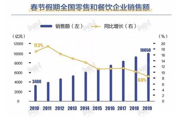 春節黃金周向來是中國消費表現最為強勁的時段,今年亦不例外。但與往年相比,今年國內春節期間的各項消費指標增速均出現了不同程度的回落,消費增速創下8年新低。根據中國商務部最新發布的數據,2019年春節(2月4日至10日),全國零售和餐飲企業實現銷售額約10050億元,比去年春節黃金周增長8.5%,相比去年同期增速10.2%出現回落。