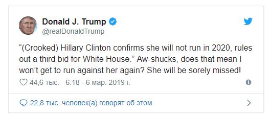 据“今日俄罗斯”3月6日报道,特朗普在其推特上写道,“(哎呦喂)希拉里·克林顿证实她不会在2020年参选,排除了第三次角逐白宫(宝座)的可能性。哦,见鬼,那是不是意味着我再也不能和她PK了?我会非常想念她的!”