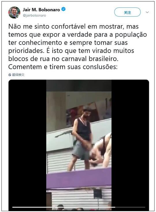 博索纳罗在推特表示:“公开这段视频让我觉得不舒服,但我们必须揭露事实让大众知道并做出优先选择。这就是巴西狂欢节街头派对的模样。”他还邀请网友留言并分享看法。