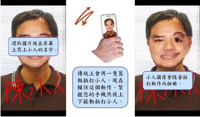 首先友善地帮目标小人拍张照片,然後在 APP输入小人照片,再把手机变身拖鞋上下摇晃打打打,打到小人(照片)脸容扭曲变猪头!