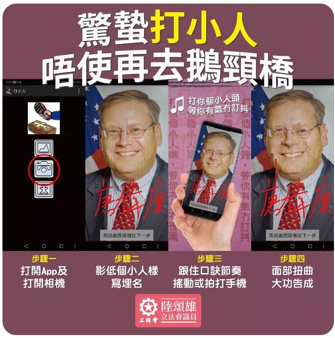 言论一向惹火的工联会立法会议员陆颂雄今天在facebook教网民用手机应用程序打小人,不过竟用美国驻港澳总领事唐伟康做「人办」。陆颂雄解释,选做唐伟康做例子是因为他「之前乱噏」和「衰多口」。