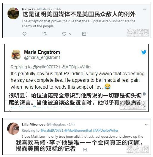 马修·李的精彩表现在推特上也得到了不少好评,也有不少网友表达了对美国“双标”、“谎言”的不满: