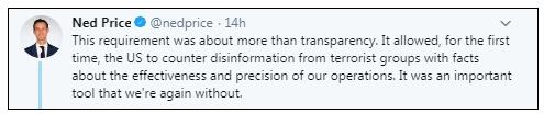 奥巴马政府的前国安会发言人奈德·普莱斯(Ned Price)形容此举“短视”(short-sighted),他表示:“恐怖分子们经常歪曲关于无人机空袭有效性与精确性的事实”。公开平民伤亡数据本可以作为反驳、以正视听,如今“只会让敌人一直以来的煽动更加有效”。