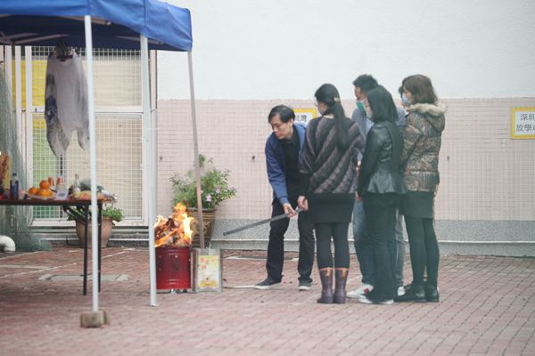 昨晨10時許,墮樓林老師父親和胞弟,由親友陪同到學校出席打齋儀式。林父指,至今校長未有接觸過家屬,他亦不想見到對方;聲言會向學校追究。有家長昨晨帶來鮮花,放在校門外,並鞠躬致祭。