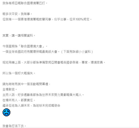 另外,一名自稱肯亞聯合國環境署職員的網民,在一個網上討論區發帖,指「我唯一一個香港環境署嘅前輩同事,似乎出事…」,該名網民說,「今個星期喺聯合國環境大會。一個全球各國政府有關環保嘅最高級大會,呢班飛機上面,大部分都係準備嚟肯亞開會嘅各國參與者,專家,環境官員,所以係一個好大嘅損失。」