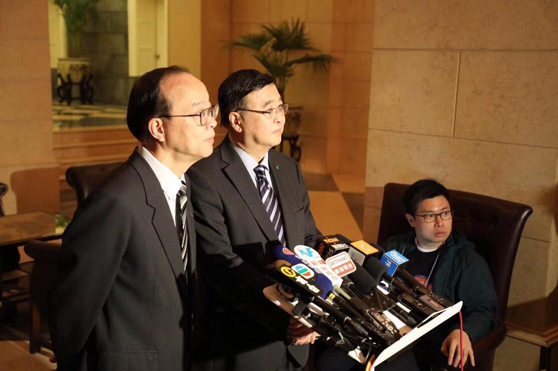 港区全国人大代表团团长马逢国、副团长黄玉山在北京向本港媒体发布王敏刚先生逝世消息