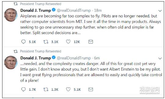 特朗普:飞机变得太复杂 我可不想让爱因斯坦当飞行员