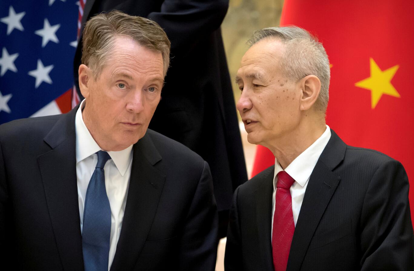 劉鶴(右)和萊特希澤在第六輪中美經貿磋商上對話。 路透社