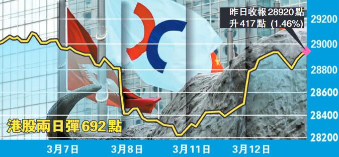 3月3日全國兩會拉閘帷幕,市場憧憬利好消息,上周一港股一度升至29241點,升逾8個月高位,收升147點報28959點。上周二全國人大會議展開,國務院總理李克強發表政府工作報告,港股缺乏方向,全日只升2點。周三恒指再漲76點,成功收企於二萬九,收報29037點。上周四華為決定控告美國政府違憲,市場憂慮新一輪中美紛爭爆發,港股當日挫258點報28779點,失守十天線。當晚歐洲央行下調歐元區經濟增長預測,加上市場預期美國將公布的就業數據轉差,同時又擔心中美貿易談判或進一步惡化,在滬指跌穿三千大關之下,港股上周五最多曾大瀉578點低見28201點,跌穿250天線(28205點),最終收報28228點,仍瀉551點(1.91%)。
