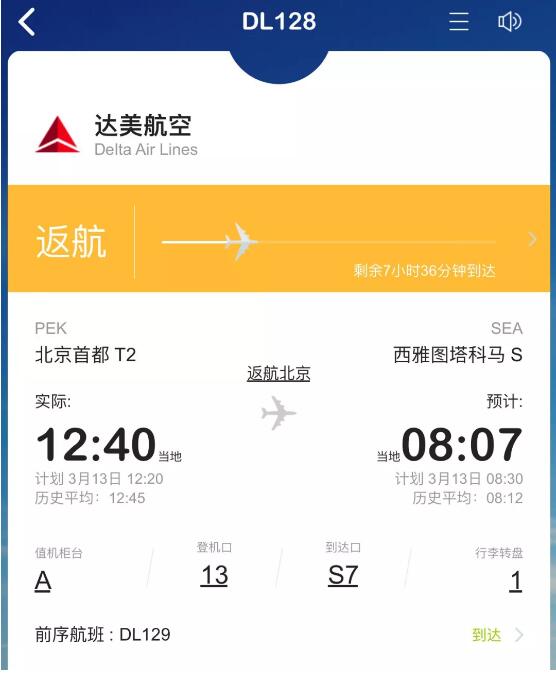 公开资料显示,DL128次航班原计划12点20分从北京首都机场起飞,于当地时间3月13日上午8点30分经停美国西雅图,随后飞往美国洛杉矶。截至发稿时,飞常准等航空APP已显示该航班状态为“返航”。