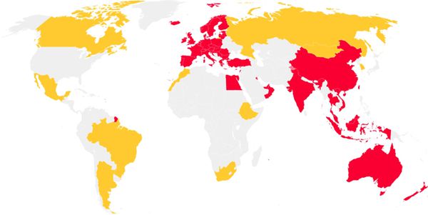 紅色為頒令停飛波音737 MAX地區,黃色為航空公司自發停飛地區。網絡圖片