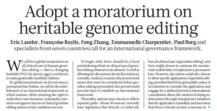3月14日,《自然》杂志刊登15位基因编辑领域的权威学者呼吁,应全面暂停可遗传基因编辑的应用,建立一套国际通用的监管框架。]