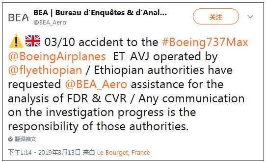 法国民航安全调查分析局13日在其推特上写道:“埃塞俄比亚政府请求法国民航安全调查分析局帮助破译飞行数据和语音记录仪,有关调查进程的任何消息由该国政府负责发布。”