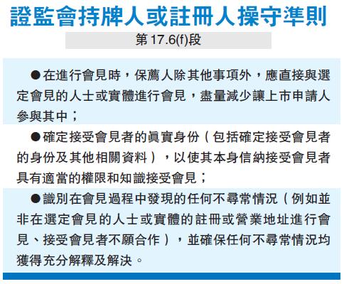 事實上,證監會去年三季度對持牌機構進行81次現場視察,亦審閱了118宗新上市申請。對於應否進一步收緊保薦人監管,有律師事務所合夥人認為,證監會已與保薦人及市場就此關注有足夠的溝通及知會,暫不預期監管當局會進一步收緊對保薦人的監管,建議保薦人在盡職調查工作上,應保持專業及懷疑的態度、盡量減低上市申請人參與盡職調查的機會、跟進申請人未回覆的問題等,並要有良好的備存紀錄系統。