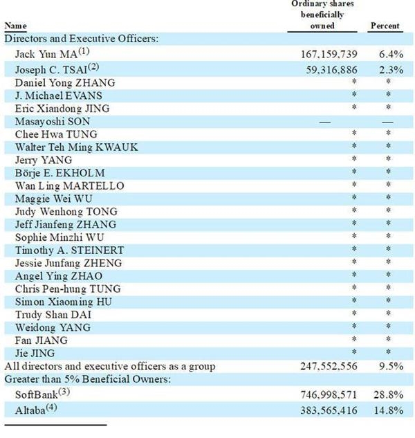 据SEC文件显示,截至2018年6月18日,马云持有阿里6.4%股权,蔡崇信持有2.3%的股权。