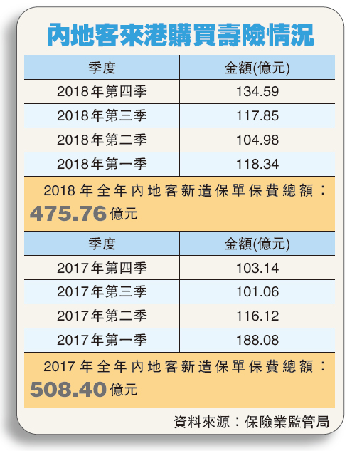 近年內地客來港買保險的熱潮轉淡,去年相關新造保單保費按年跌6.4%至476億元,佔整體約29.4%,其中約96%是醫療或保障類型的保險產品,約99%為非整付保費保單,即保費非以一筆過模式支付。