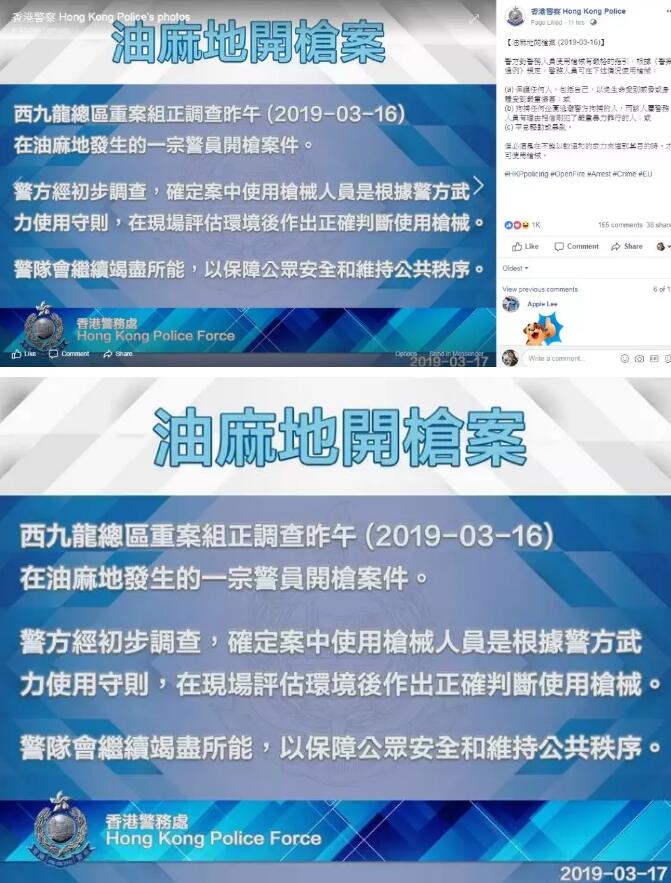 对于昨日事件,警方今日凌晨于香港警察Facebook上发帖,指警方对警务人员使用枪械有严格的指引,并列出在三种情况下,警员可开枪,包括为保护任何人、拘捕任何企图逃避警方拘捕的人,及平息骚动或暴乱。警方又指,经初步调查,开枪的警员是根据武力使用守则,“作出正确判断”后使用枪械。