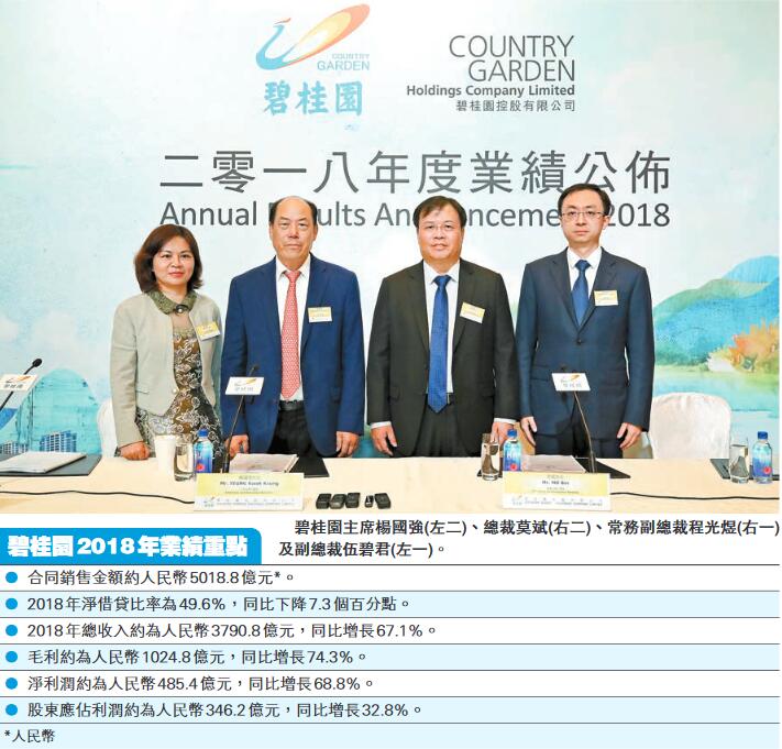 碧桂園昨日公布2018年度業績報告,毛利潤1024.8億元,同比增長74.3%;淨利潤按年勁升68.8%至485.4億元;股東應佔核心淨利潤達341.3億元,同比增長38.2%。