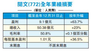 【香港商報網訊】記者張智榮報道:閱文集團(772)昨日公布截至去年12月底止年度業績,按年多賺63.7%至約9.1億元(人民幣,下同)。每股基本盈利1.01元,不派末期息。